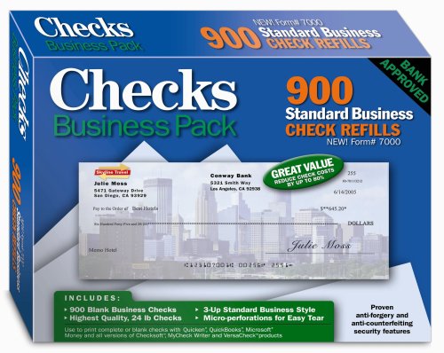 Get 900 high-quality business check refills to meet your printing needs. Checks Business Pack includes 3-Up business style paper with superior security features and compatibility with Quicken®, Quickbooks®, Microsoft® Money, all versions of Checksoft¿, MyCheck Writer, and VersaCheck® products. Save money and reduce your check costs by up to 80%. Checks Business Pack includes: 900 business checks; 3-Up standard business style; Form #7000; Blue and green color options; Highest quality, 24 lb Read More »